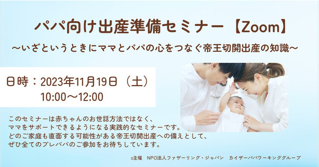 パパが知識を身につけ、出産と産後を主体的にサポートしていくことで家族に笑顔が増えます。このセミナーは赤ちゃんのお世話方法ではなく、ママをサポートできるようになる実践的なセミナーです。どのご家庭も直面する可能性がある帝王切開出産への備えとして、ぜひ多くのプレパパのご参加をお待ちしています。