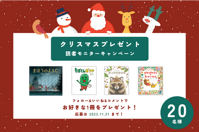 世界文化社は、プレゼントにぴったりの『まほうのよるに』、『さぼてんぼうや』、『ポコタのきのみ』、『ぽわぽわもりの おかいもの』の4冊よりお好きな1冊をお選びいただき、お子様が実際に絵本を読んで楽しんでいただいている様子やご感想をInstagramにご投稿くださる読者モニター20名様を、2023年11月21日(火)まで募集いたします。ぜひふるってご応募ください。