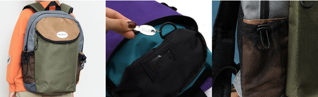 サイドポケットには、調節可能な“絞り‘‘がついていて、水筒や折り畳み傘などをサイズ調節して入れることで