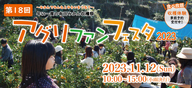 ※みかん収穫体験を行う園地は会場より徒歩10分ほど離れた場所にあります。会場にはフードブース、企画ゲーム(一部ゲームを除く)があり、会場への入場は無料、入園チケットも不要です。
