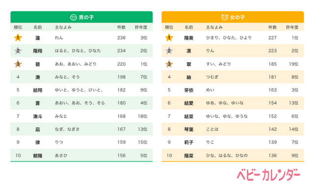 女の子の名前ランキングTOP3は、1位「陽葵」、2位「凛」、3位「翠」という結果に。1位の「陽葵」と2位の「凛」はどちらも2年連続で順位をキープ。4位の「紬」は、昨年8位から一気にランクを上げました。さらに、「結愛」は昨年13位から6位へ、「琴葉」は昨年14位から8位とそれぞれTOP10入りを果たしました。女の子は和風なイメージを持つ名前の人気が根強いようです。