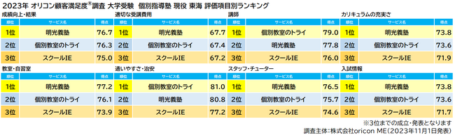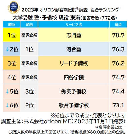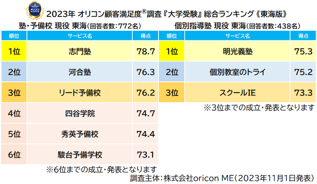 2023年 オリコン顧客満足度(R)調査 大学受験 塾・予備校 現役 東海