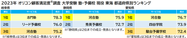 「岐阜県」部門で【志門塾】、「静岡県」部門と「愛知県」部門で【河合塾】が、それぞれ昨年につづき2年連続1位を獲得し、地場に根付いた企業がランクインした結果となりました。