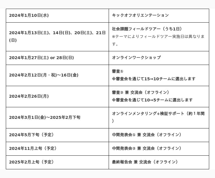 リディラバが有料プログラムとして実施する社会課題の現場視察を目的としたフィールドツアーや、ビジネスのコンセプト案を作成するオンラインワークショップなど、すべてのプログラムを参加者に無料*1 で提供します。なお、2024年2月下旬に行われる審査にて選出された5チームには、事業検討のためのメンタリングや事業実証・検証費を最大100万円/1チームに提供します。*2