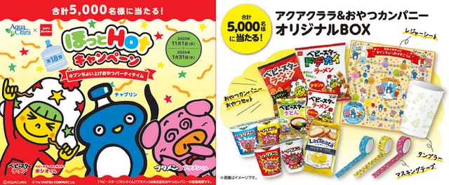水を通じて“生活”“環境”“健康”の創造を目指すアクアクララ株式会社(本社:東京都港区、代表取締役社長:赤津裕次郎)は、全国のアクアクララ会員を対象としたクローズドキャンペーンとして、株式会社おやつカンパニー(本社:三重県津市、代表取締役社長:手島文雄)の人気キャラクター「ホシオくん」「ブタメンくん」とのコラボレーションキャンペーンを実施致します。