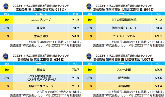 実際のサービス利用者を対象に第三者の立場で顧客満足度調査を実施する株式会社oricon ME(本社:東京都港区 代表取締役社長:小池 恒 略称:オリコン)は、『高校受験』を目的とした塾についての満足度調査を実施し、2023年11月1日(水)14時にその結果を「オリコン顧客満足度(R)」公式サイト内( https://life.oricon.co.jp/ )にて発表いたしました。本稿では、北海道と東北の結果をお伝えします。