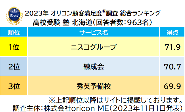 高校受験を目的とし、中学生を対象に一定のカリキュラムに沿って集団授業を行っている塾を調査対象とし、その塾に通う子どもの保護者963人が回答した調査結果をもとに集計した『高校受験 塾 北海道』ランキング。総合1位は、【ニスコグループ(株式会社ニスコ 本社:北海道札幌市)】が3年連続5度目の受賞となりました。