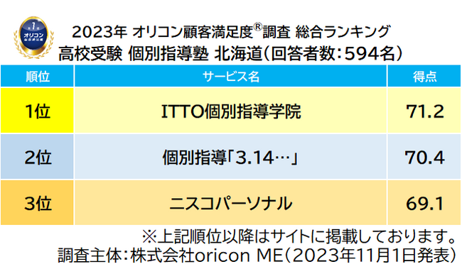 高校受験を目的とし、中学生を対象に一人一人に合わせたカリキュラムで個別指導を行っている塾を調査対象とし、その塾に通う子どもの保護者594人が回答した調査結果をもとに集計した『高校受験 個別指導塾 北海道』ランキング。総合1位は、【ITTO個別指導学院(自分未来きょういく 株式会社 本社:愛知県名古屋市)】が初の受賞となりました。