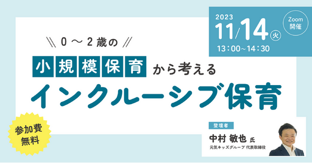 子どもたち一人ひとりの個性や背景に合わせて、どのようにインクルーシブな保育をしていくべきか悩まれている保育士も多いと思います。本セミナーでは、保育施設を経営している元気キッズグループ代表取締役の中村敏也氏にご登壇いただき、具体的に取り組まれている内容についてお話をしていただきます。