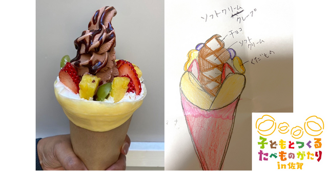 子どもとつくる食べものがたりに応募したきっかけは、お母さんから描いてみたら?と言われて描いたのがきっかけでした。お菓子を作るのも食べるのも好きで、クレープに果物、ソフトクリーム大好きなものが一緒に食べれたらいいなと思って描きました。ソフトクリームのクレープはあまり見た事がなかったのでソフトクリームにしました。