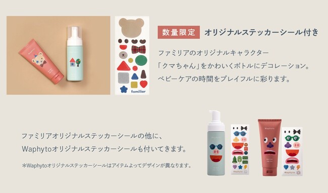 クマちゃんのお顔など、自由にデコレーションしたマイボトルで赤ちゃんとのスキンケア時間を楽しいひと時に。今だけ、ファミリア限定デザインのオリジナルステッカーシールと、Waphytoオリジナルステッカーシールの2枚セット。