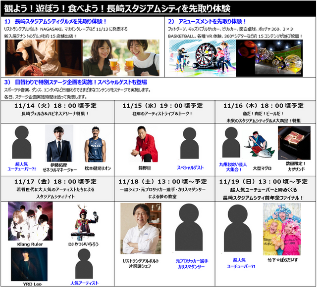 株式会社ジャパネットホールディングスのグループ会社で地域創生事業を担う株式会社リージョナルクリエーション長崎(本社:長崎県長崎市/代表取締役社長:岩下英樹)は、長崎スタジアムシティの開業1年前イベント「NAGASAKI STADIUM CITY 前年祭」を2023年11月14日(火)~11月19日(日)に出島メッセ長崎にて開催します。長崎スタジアムシティに入居が決まっている飲食店舗のブースや長崎初出店のアミューズメント施設のコンテンツ体験、スタジアム座席体験などに加え、日替わりで特別ゲストが登場するステージイベントを毎日開催いたします。