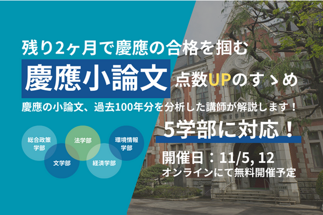 英語や社会と同様に点数が配分されている小論文、どこまでやれば合格か、あなたは理解して勉強していますか?合格に必要な勉強と自分の合格までの足りない部分、もう一度確かめてみませんか?LogicLinkでは、慶應5学部対応小論文解説講座を11月5日(日)と11月12日(日)2日間にわたって無料開催いたします。また、各学部過去10年分から分析された予想問題で、あなたの合格までの最短ルートを確認してみましょう。