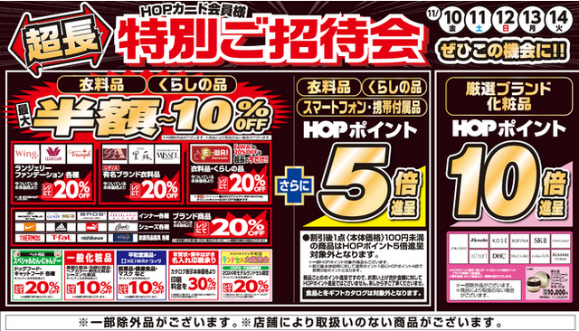 ・【アル・プラザ小杉】の11月12日(日)は、全館HOPポイント5倍となり、食品も対象となります。超長特別ご招待会 衣料品・くらしの品 HOPポイント5倍進呈除外日となります。