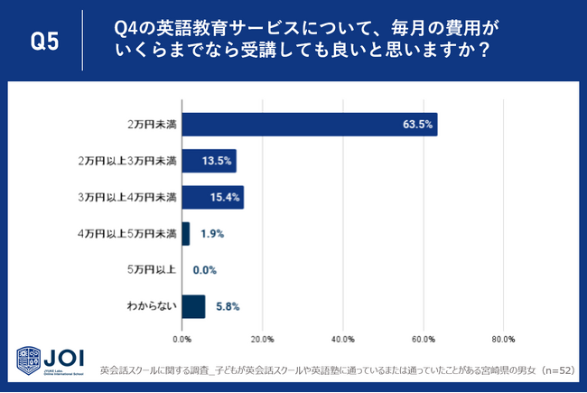 Q4で「受講したい」「料金が安ければ受講したい」「興味がある」と回答した人に、Q5で、「Q4の英語教育サービスについて、毎月の費用がいくらまでなら受講しても良いと思いますか?」と質問したところ、最も多い63.5%の回答者は2万円未満が適切と感じています。13.5%は2万円以上3万円未満、15.4%は3万円以上4万円未満と答えました。対照的に、4万円以上の費用を考える回答者は極少数で、4万円以上5万円未満が1.9%、5万円以上が0.0%でした。これにより、宮崎県では多くの人が3万円未満の価格帯を望んでいることが明らかとなりました。