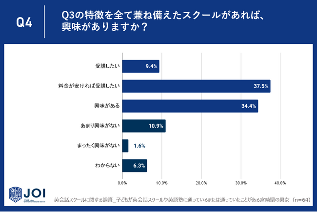 Q4で「Q3の特徴を全て兼ね備えたスクールがあれば、興味がありますか?」と質問したところ、宮崎県では9.4%が受講を希望し、37.5%は料金が手頃であれば受講したいと考えています。さらに、34.4%は興味を示していると回答しました。多くの人がこのような特徴を持つスクールに一定の興味を示していることが分かります。