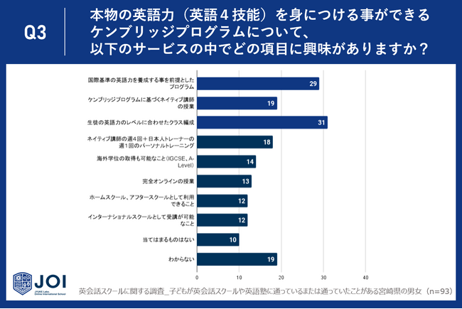 Q3で「本物の英語力(英語4技能)を身につける事ができるケンブリッジプログラムについて、以下のサービスの中でどの項目に興味がありますか?(複数回答可)」と質問したところ、宮崎県で最も多かったのは「生徒の英語力のレベルに合わせたクラス編成」で31名でした。次いで、「国際基準の英語力を養成する事を前提としたプログラム」には29名、「ケンブリッジプログラムに基づくネイティブ講師の授業」には19名が興味を持っています。一方で、「ホームスクール、アフタースクールとして利用できること」や「インターナショナルスクールとして受講が可能なこと」に関心を持つ人はやや少なめで、いずれも12名の回答でした。これらの結果から、多くの人は実用的な英語力の養成や個別のニーズに応じた指導に重きを置いていることが伺えます。