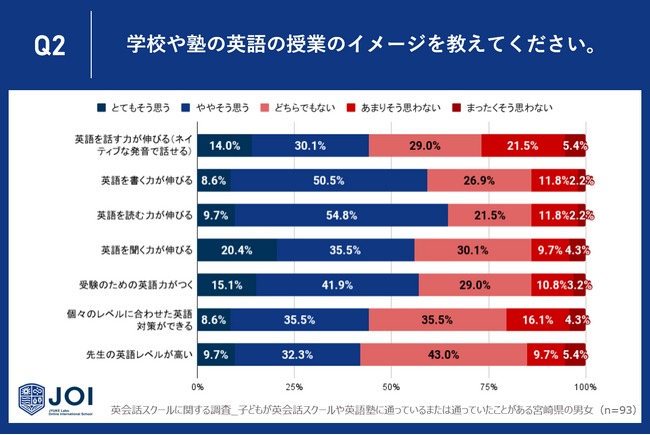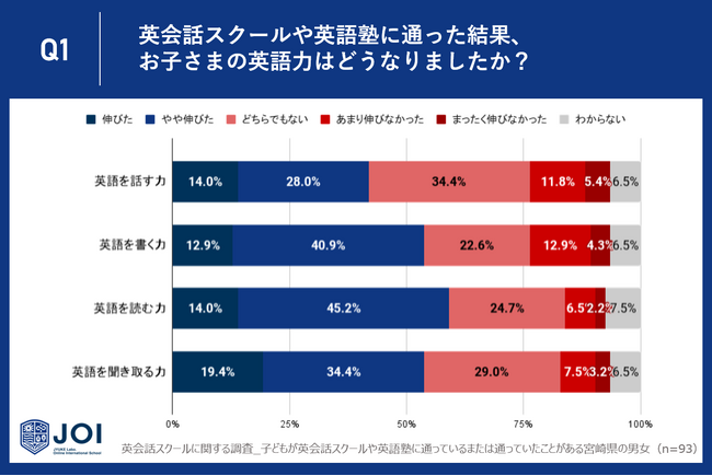 じゅけラボOnlineインターナショナルスクールJOIは、子どもが英会話スクールや英語塾に通っているまたは通っていたことがある宮崎県の男女93人に、英会話スクールや英語塾の効果に関するアンケート調査を実施しました。