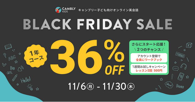 Cambly Inc.(本社:アメリカ・サンフランシスコ、日本代表:佐藤 亜希子)が提供する子ども向けオンライン英会話サービス「Cambly Kids(キャンブリー キッズ)」は、11月6日(月)から30日(木)まで、1年コースのレッスン受講料が36%OFFとなるBLACK FRIDAYセールを開催いたします。