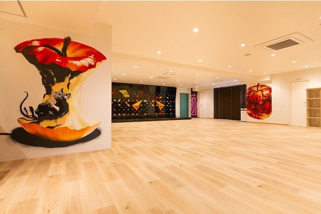 ボルダリングの壁や、リンゴのアートが印象的な広いフリースペース