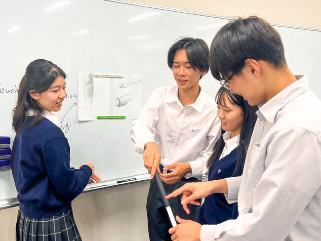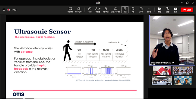 かえつ有明中・高等学校のチームは、STEMのスキルや知識を駆使し、オーチスの社員サポーターたちから助言を受けながら、予選大会のテーマである「コミュニティの課題を解決する包括的なモビリティ・ソリューションの構築」に取り組みました。予選大会で、学生たちは、人混みの多い東京で暮らす視覚障害者がより安心安全に移動できるよう、杖にIoT技術と微細な振動を発するハプティック技術を組み合わせたソリューションを発表しました。そのソリューションにおいて、視覚障害者は杖から発する振動を感知することで、障害物を避け、道を間違えることなく目的地まで到着することが可能になります。学生たちのプレゼンテーションは審査員から高い評価を受けました。