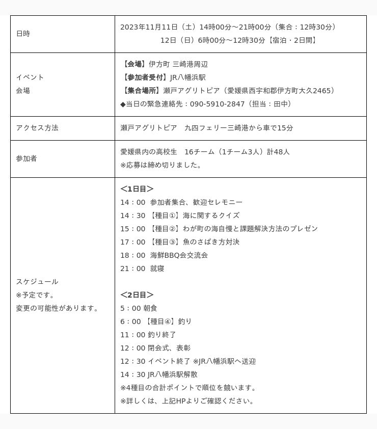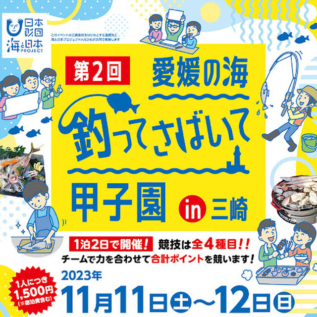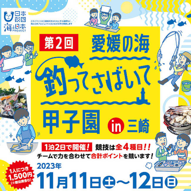 (一社)海と日本プロジェクトinえひめは、11月11日(土)、12日(日)の2日間、伊方町・三崎港周辺で「愛媛の海釣ってさばいて甲子園」を開催します。身近な海のレジャーである「釣り」を通して、地元の海への興味や関心を育み、海の変化や抱える課題に対して理解を深めることを目的とした高校生対象のイベントです。また、海に興味のあるユース世代が交流する機会を作ることで、今後愛媛の海の課題に対して主体的なアクションを起こす人材を育成し、ユース世代を中心に地元の海を守るムーブメントを醸成することを目的としています。