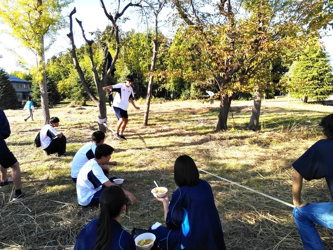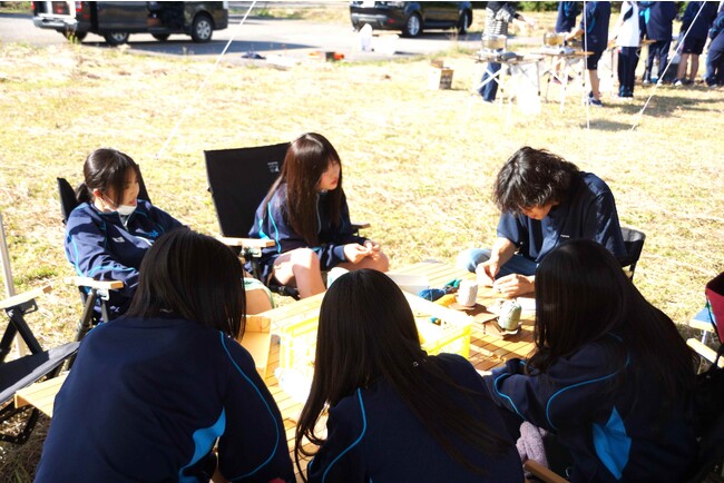 今回、国際自然環境アウトドア専門学校から参加した学生は、スラックラインや焚火を囲んでのティータイム、フィンランド発祥のユニバーサルスポーツであるモルック、木工クラフト体験などを通して、高校の敷地内という身近な場所で、キャンプ用具やアウトドア用品を使って、気軽にアウトドア体験をできる場づくりを行いました。事前の企画の中で、山谷産業のスタッフの皆様と、どんな参加者でも安心してアウトドア体験ができる場づくりを目標とし、全体として誰もが心から楽しめる空間を作ることができました。