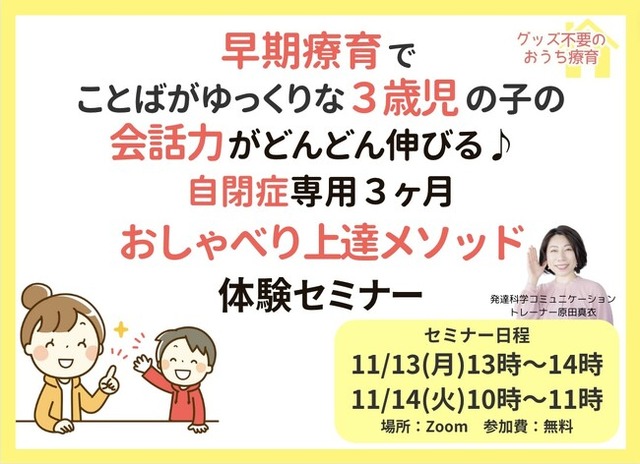 この度、言葉がゆっくりな3歳児のお子さんをもつ親御さん向けに、言葉を伸ばす声かけを体験することができるセミナーを開催致します。