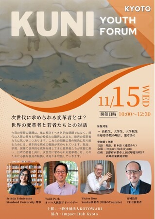 変革者の旅路は、物質的なニーズの充足から社会的課題への取り組み、それから既存の環境の革新を超えていく新たな世界の創造へと、人類自身の進化の過程を映し出しています。それは、世界に真善美という変化をもたらそうとする集団的欲求であり、変化する世界からの要求に応え、成長し、その中でさらに深い意味を追求していこうとする、人間の本質の顕れであります。私たち一般社団法人KOTOWARIは「KUNI Youth Forum Kyoto」の開催を通して、この本質の表顕に寄与したいと願っています。