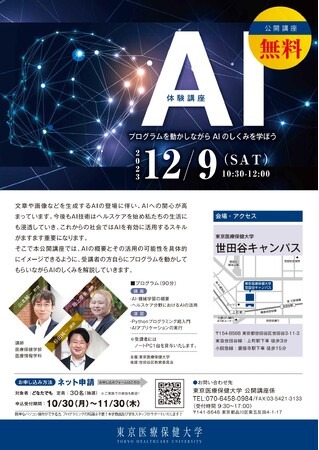 学校法人 青葉学園が運営する東京医療保健大学(本部:東京都品川区、理事長:田村哲夫、学長:亀山周二、以下「本学」)は、公開講座「AI体験講座 ~プログラムを動かしながらAIのしくみを学ぼう~」を2023年12月9日(土)に開催いたします。