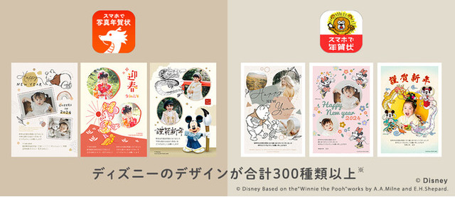 「ディズニー」の代表キャラクターである「ミッキー&フレンズ」をはじめ、「くまのプーさん」や、「ディズニープリンセス」など、充実のキャラクター数とデザインバリエーションで、2アプリ合計300種類以上の「ディズニー」デザイン年賀状をご用意しています。