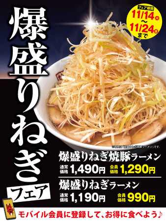 ・公式SNS「爆盛りねぎラーメンフェア」投稿画面もしくはモバイル倶楽部クーポン画面を提示してご注文ください。