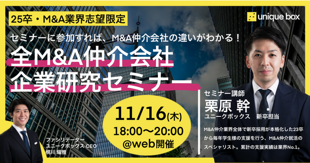 M&A仲介業界への転職支援、就職支援を手掛ける合同会社ユニークボックスと、学生向けビジネスを手掛ける株式会社Givezが共催で、25卒の学生向けに就活セミナーを開催します。