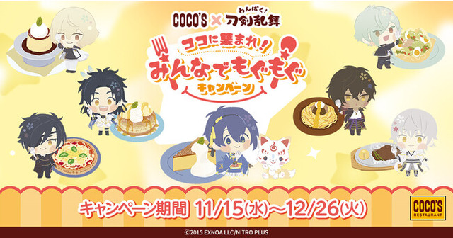 今回のキャンペーンでは、『わんぱく!刀剣乱舞』のパステルでキュートな絵柄の刀剣男士をイメージしたコラボメニューを販売します。コラボメニューを含む対象メニューから1品のご注文につき、ココスオリジナルクリアファイル(A4)を1枚プレゼントします。
