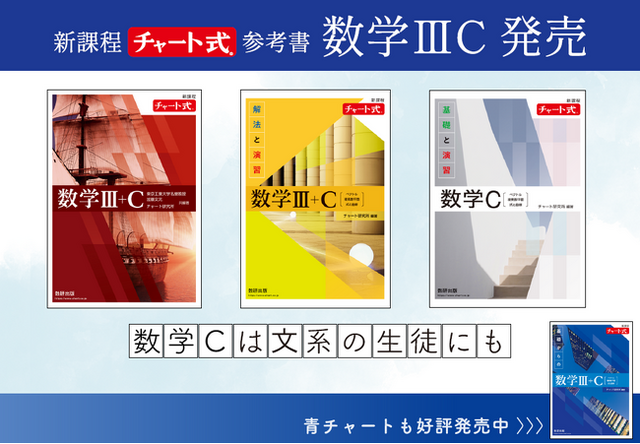 新課程では数学Cが復活し、学習内容も旧課程と比べて大きな変更がありました。チャート式参考書は、新課程の数学IIICに対応する参考書としてはいちはやく店頭発売を開始し、新課程で学ぶ生徒をサポートします。数学Cは共通テストの出題範囲にも指定されているため、共通テストを受験する生徒は文系であっても数Cを学ぶケースがあります。チャート式参考書では、赤チャート、青チャート、黄チャート、白チャートのすべてで数学Cを発売します。(数学III+Cまたは数学Cとして発行)
