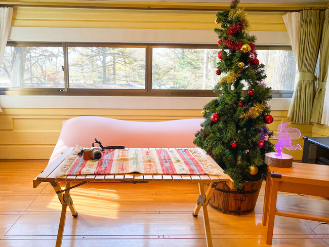 2. 1棟独立型コテージがクリスマス仕様に:クリスマスツリーやリースを飾り、お部屋でもわくわく感に包まれる。
