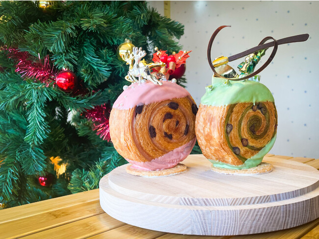 1.クリスマス切り株クロワッサン:赤と緑のクリスマスカラーでコーティングしたクロワッサンに、トナカイなどのクリスマスらしいオーナメント付き。ふたりの幸せの願いを込めたクロワッサンで味覚でもクリスマスを楽しんで。