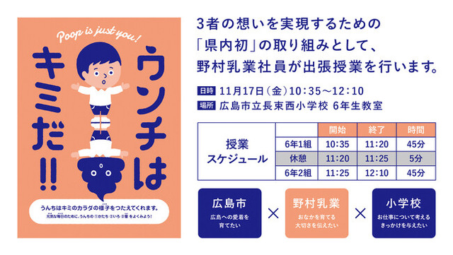 広島市、野村乳業、小学校、3者の想いを実現するための「県内初」の取り組みとして、野村乳業社員が出張授業を行います。