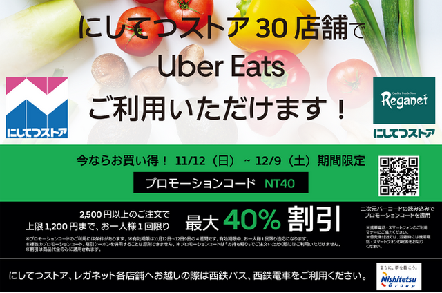 株式会社西鉄ストア(本社:福岡県筑紫野市、代表取締役社長執行役員:秋澤 壮一)は、Uber Eats Japan合同会社 (本社:東京都港区、ゼネラルマネジャー:中川 晋太郎)が提供するフードデリバリーサービス「Uber Eats(ウーバーイーツ)」とコラボし、40%オフクーポンを配布するキャンペーンを実施いたします。
