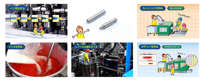 子どもたちに身近である、当社のカラフルで発色の良いゲルインキボールペン「ジュース」を例にして、「ボールペンができるまで」の製造工程を工場見学できる動画を掲載しています。