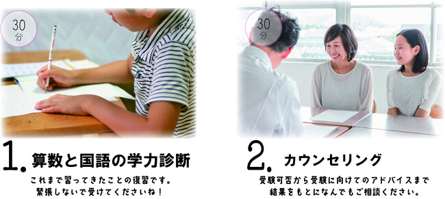 算数と国語の学力診断とカウンセリング合わせて1時間ほどと、ライトなキャンペーンになっています。