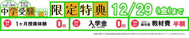12月29日(金)までに入塾すると、入学金無料のほか、新年度教材費がなんと半額になります。