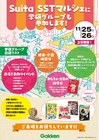 株式会社 学研ホールディングス(東京都・品川区/代表取締役社長:宮原 博昭、以下当社)は、11月25日(土)、26日(日)に「Suita サスティナブル・スマートタウン」(大阪府吹田市、以下Suita SST)で開催される「Suita SSTマルシェ」(以下、当イベント)に、Suita SSTプロジェクト参画企業の一員として参加いたします。
