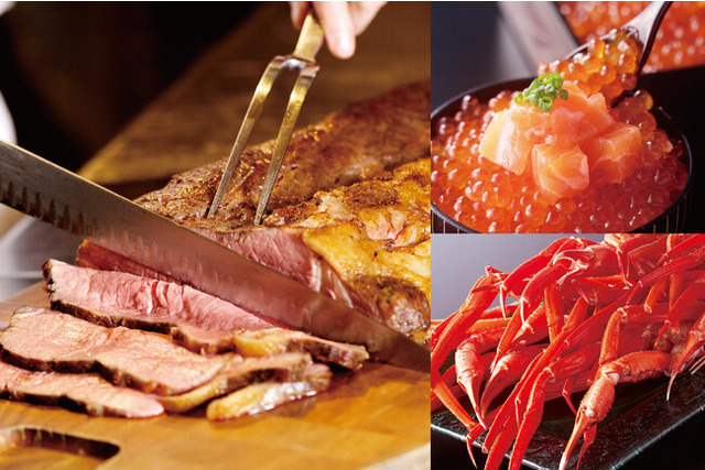 「ローストビーフ レフォール入りグレービーソース」「牛サーロインの鉄板焼き すりおろしオニオンソース」「大きな海老フライ タルタルソース」「蟹の氷台盛り」「寿司」「いくらの三色丼」「スイーツ」