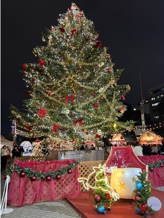 大きなクリスマスツリーのもとでドイツグルメや雑貨が並び、土曜・日曜・25日(月)はサンタクロースと記念撮影も楽しめます。