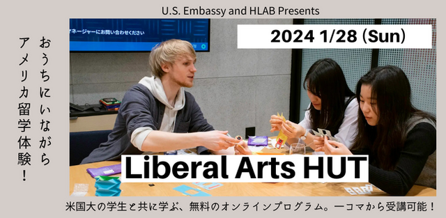 2023年4月、岸田総理大臣が議長を務める教育未来創造会議で取りまとめられた「未来を創造する若者の留学促進イニシアティブ」の中で、日本人留学生の海外派遣の目標数値を50万人に引き上げる提言がなされました。今後、日本からも留学生が加速度的に増えていくことが予想されます。その中でもアメリカ合衆国は、留学先として世界でもトップレベルの教育を受けられる国です。そんなアメリカ留学を無料で体験できるオンラインプログラム”Liberal Arts HUT Fes”を、一般社団法人HLAB(本社・東京都世田谷区、代表理事・小林亮介、以下HLAB)は在日米国大使館と共に開催いたします。