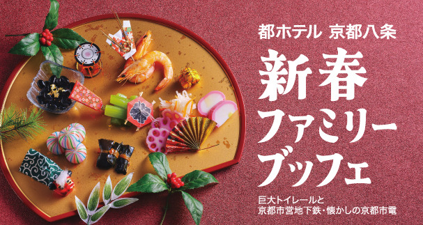 新年を彩るバラエティー豊かなブッフェ料理はローストビーフなど定番の人気メニューを中心に多数ご用意しています。お食事の合間には、獅子舞や和芸ジャグリングなどの新春ステージをお楽しみください。さらに、昨年好評だった巨大トイレール展示が今年も登場!京都市営地下鉄駅員の制服で撮影できるキッズフォトスポットやお楽しみ抽選会など、大人からお子さままでお楽しみいただけるイベントが盛りだくさんです。新しい年の始まりは、ご家族、ご親戚揃って思い出に残る楽しい時間をお過ごしください。