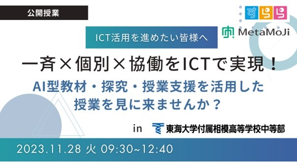 AIを活用したアダプティブな対話式 ICT 教材の開発と提供を行う株式会社すららネット(本社:東京都千代田区、代表取締役:湯野川孝彦)では、2023年11月28日(火)9時30分から12時40分まで、「すらら」を中心にICTを活用した数学と探求学習の授業を実際に現地で見学できる公開授業を、東海大付属相模高等学校中等部(神奈川県相模原市)にて開催します。
