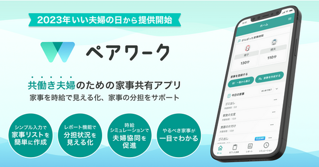 ペアワークは、共働き夫婦のための家事共有アプリです。家事の共有や取り組んだ人・時間・労力を可視化することで、共働き夫婦の家事分担をサポートします。