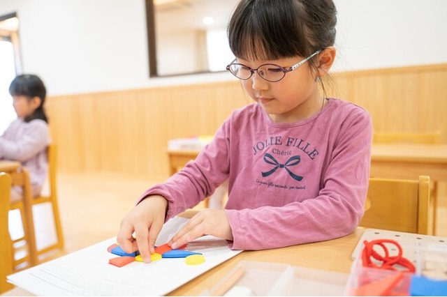 IQパズルは、小学校の算数を先取りするものではなく、「覚える」ことより「考える」ことを重視し、映像やプリント、オリジナル教具などを使い、楽しみながら「量感」「空間把握能力(目の前にないものを具体的な事象としてイメージする力)」「仮説思考力(仮説を立てて検証し、試行錯誤できる力)」を育みます。